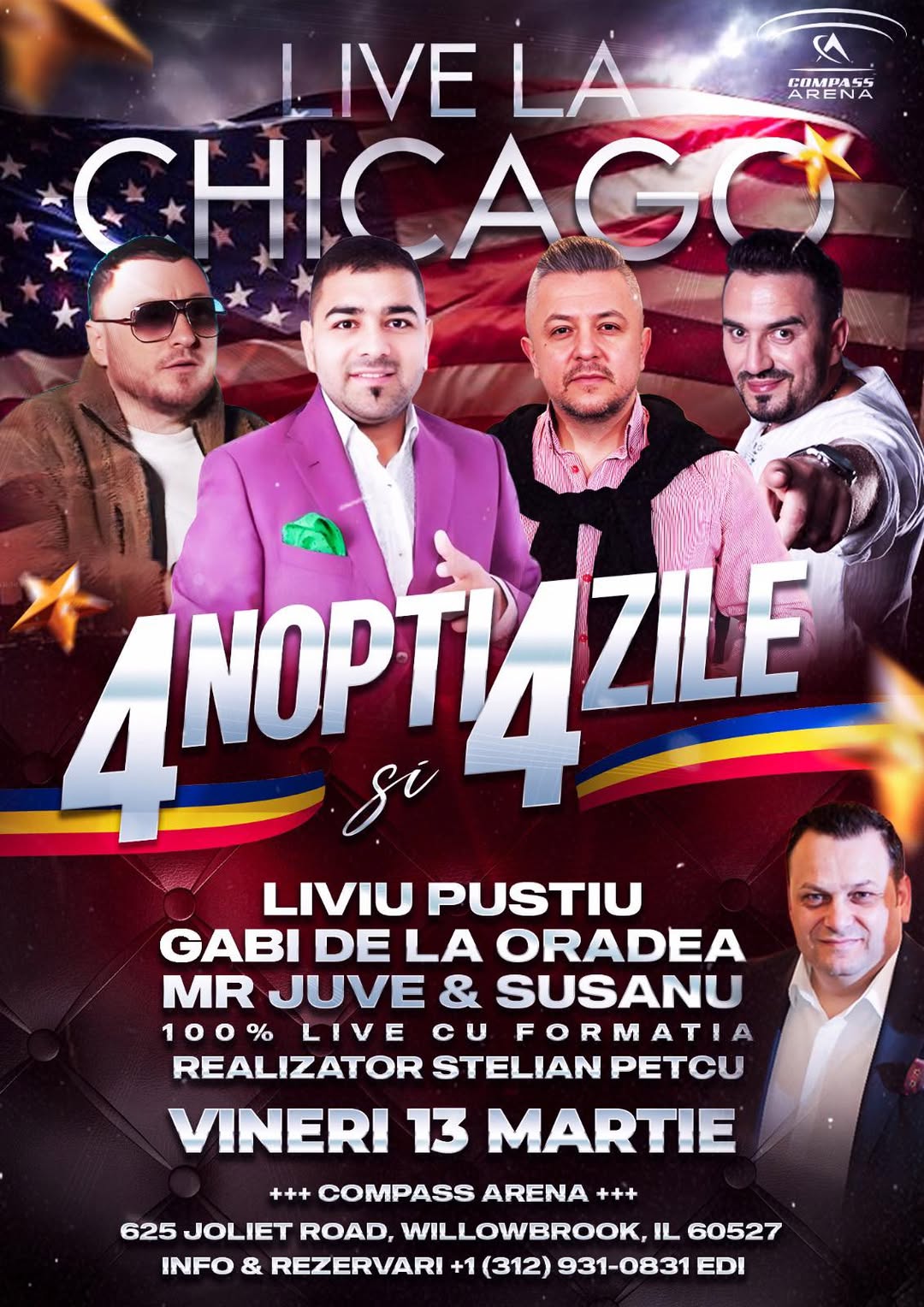 Chicago, ești gata de petrecere? Se anunță o noapte legendară la Compass Arena! Liviu Puștiu, Gabi de la Oradea ,Stelian Petcu, Mr. Juve și Susanu vin să facă show ‘4 nopți și 4 zile’! 100% LIVE cu formația, nu aveți voie să lipsiți!